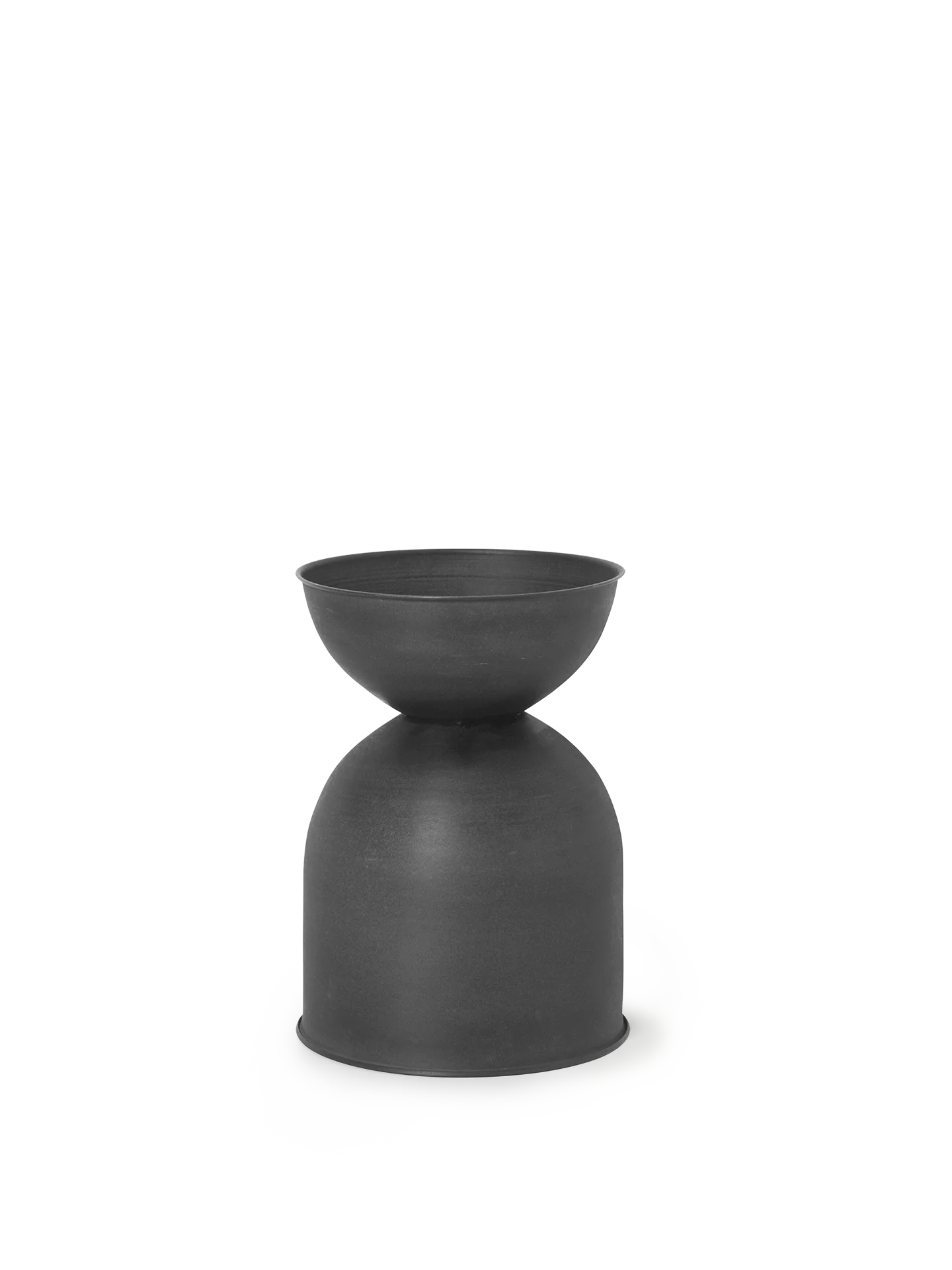 As a grand gesture to your home and plants, the Hourglass Pot gives your plants an elevated stand and roomy container in which to spread their roots. You can use the pot both ways according to the plantâs needs, and no matter which way you turn it you are sure to make a voluminous statement. The pots are made of metal with a matte finish and have been treated to be suitable for outdoor use.